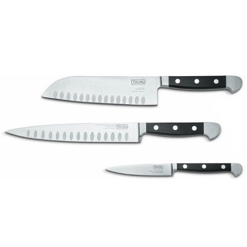 Viking Professional Series 3 Piece Stainless Steel Santoku Cutlery Set Hand-forged in Solingen, Germany, the Professional collection is made of high-carbon stainless steel. All the knives have a single-piece construction and easy to sharpen, long lasting blades. This cutlery set includes a santoku knife, a hollow-ground slicing knife, and a paring knife. Use the Santoku knife for general slicing, dicing, and mincing. Use the hollow-ground slicing knife for slicing sticky foods, such as ham and salmon since the oval blade indentations keep food from sticking. Use the paring knife for peeling and coring fruits and vegetables. The knives feature polyxymethylene handles with fiberglass reinforcement and a full tang running the length of the handles, which means that the grip conforms to the shape and follows the outline of the steel. The handles have triple rivet construction for durability and the set comes with a manufacturer's lifetime warranty.