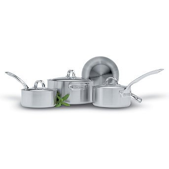 Professional Series cookware can be used on any cooking surface, including induction. Multi-Ply construction includes 18/10 stainless steel interior and exterior layers, a layer of magnetic stainless steel for induction cookers, and aluminum alloy interior layers for superior heat distribution. Multi-Ply construction extends throughout each cookware piece, including the sides. Ergonomic stainless steel handles are double-riveted and designed for optimal comfort and secure handling. lids are interchangeable with cookware of the same diameter. Ideal for the beginning cook, the Viking Professional Series 7-piece Cookware Set is made up of a well-chosen array of indispensable pieces. Viking's exclusive multi-ply construction is designed for a lifetime of performance, and uses an advanced formulation of stainless steel and aluminum alloys that deliver top-notch cooking results. . . . . Lids are interchangeable with cookware of the same diameter. Oven safe to 600 degrees F. Dishwasher safe, but hand washing is recommended. Imported from Belgium. This item is ineligible for discounts. Read moreReview Rating :