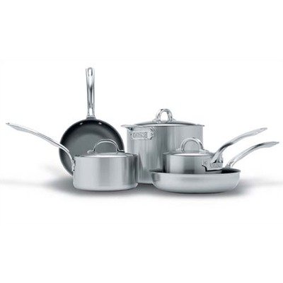 VSC1011 Features: -Can be used on any cooking surface, including induction.-Lids interchangeable with vessels of same diameter.-All handles are stainless steel, double-riveted to each vessel.-All cooking vessel and handle designs created by Viking Design and exclusive to Viking.-Manufactured in Belgium.-Dishwasher safe, but hand washing recommended for superior appearance. Construction: -Exclusive Multi-Ply construction of stainless steel and aluminum alloys.-Multi-Ply construction:.-Ergonomic handles constructed of investment-cast stainless steel and have stay-cool vent design. Warranty: -Lifetime warranty against manufacturing defects. Read morereview and image Professional Series 8 Piece Cookware Set with Non-Stick Fry Pans