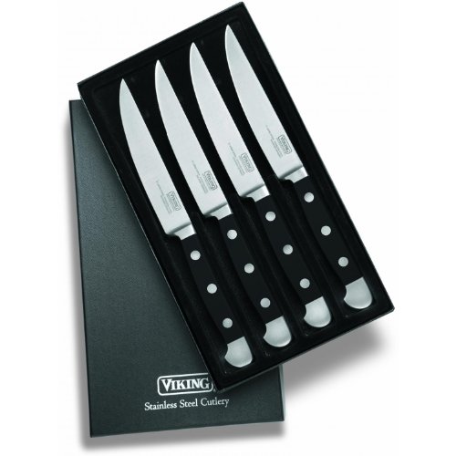 Viking Set of 4 Professional Series Steak Knife Set. If you take your steaks seriously, then you'll want to serve them with high-quality steak knives such as the Viking Steak Knife. Handmade in Solingen, Germany with authentic Old World craftsmanship using modern technology: polyoxymethaline handles with fiberglass reinforcement. Ice-hardened stainless steel increases durability, and one-piece hot drop forged method of manufacture provides balance. Made of high carbon chromium vanadium stainless steel, with a full tang running the length of the handle, which houses triple rivet handle construction. (4) 4.5-in. Steak Knives Viking Range Corporation manufactures and markets a wide range of professional kitchen appliances for home use. The private company, based in Greenwood, Mississippi, is best known for it upscale ranges, but also offers ovens, refrigerators, freezers, dishwashers, disposals, and ventilation products. In addition, Viking offers professional-grade countertop appliances such as a blender and stand mixer, a line of cookware and cutlery, and a complete set of outdoor cooking products, including gas grills with hoods, warming drawers, gas woks, outdoor refrigerated beverage centers, stainless steel cabinets, as well as professional barbecue tool sets and gloves. Viking maintains three factories in Greenwood, and operates a dozen Viking Culinary Arts Centers across the country, where cooking lessons are given and the company's products are available for purchase. The company's products are also sold through high-end dealers, housing contractors, and kitchen specialists. Internationally, Viking products are retailed in more than 80 countries.. Read more